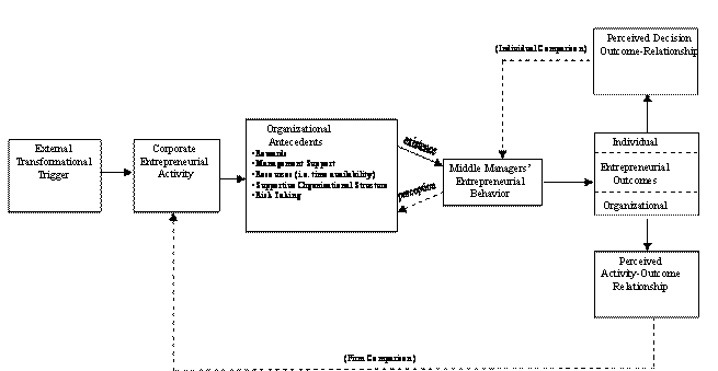 Recently, Kuratko, Hornsby, and Goldsby (2004) presented a framework that explains sustained entrepreneurial activity in terms of individual reflections on whether the outcomes of such behavior either meet or exceed the expectations set by management before undertaking the change. Quite simply, if entrepreneurial activity is not seen as worth the effort and risk; then traditional, more conservative management will take place in the future. While this model explains the psychology and decision making that takes place at the critical moment of approving or declining future entrepreneurial projects, it offers little guidance on what could or should be done up to that point.
