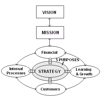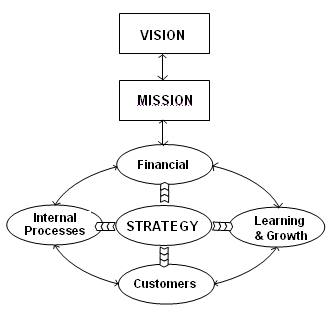 A Balanced Scorecard initiative begins with identifying strategies derived from the organization's vision and mission. Strategic themes are then developed by viewing the vision and mission statements from four distinct perspectives: Financial, Internal Processes, Customers, and Learning and Growth (Kaplan & Norton, 2004). Figure 1 provides a graphical representation of how mission and values-focused strategy drives the four perspectives.