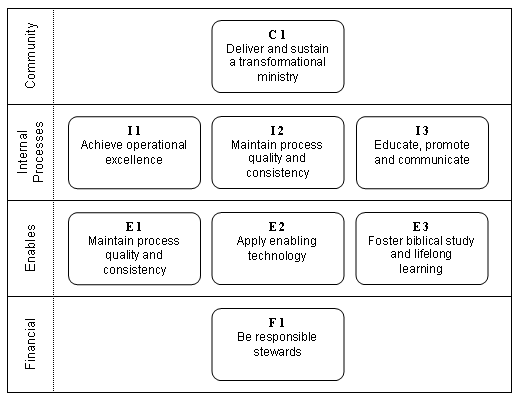 In the outreach example, the strategic planning team may feel that the "Deliver and sustain a transformational ministry" strategic theme in the Community perspective (which is identified in the "C1" box of Figure 2) is the most important objective to be accomplished in order to achieve the ministry's mission. To track the organization's progress on this objective, outreach participant data will be accumulated every quarter to assess if the objective is being met. As more data is collected, the team will need to assess whether the indicators they have defined are true representations of the ministry's success. If no new indicators are chosen, more extensive analysis should be done to formulate precise measures and targets.