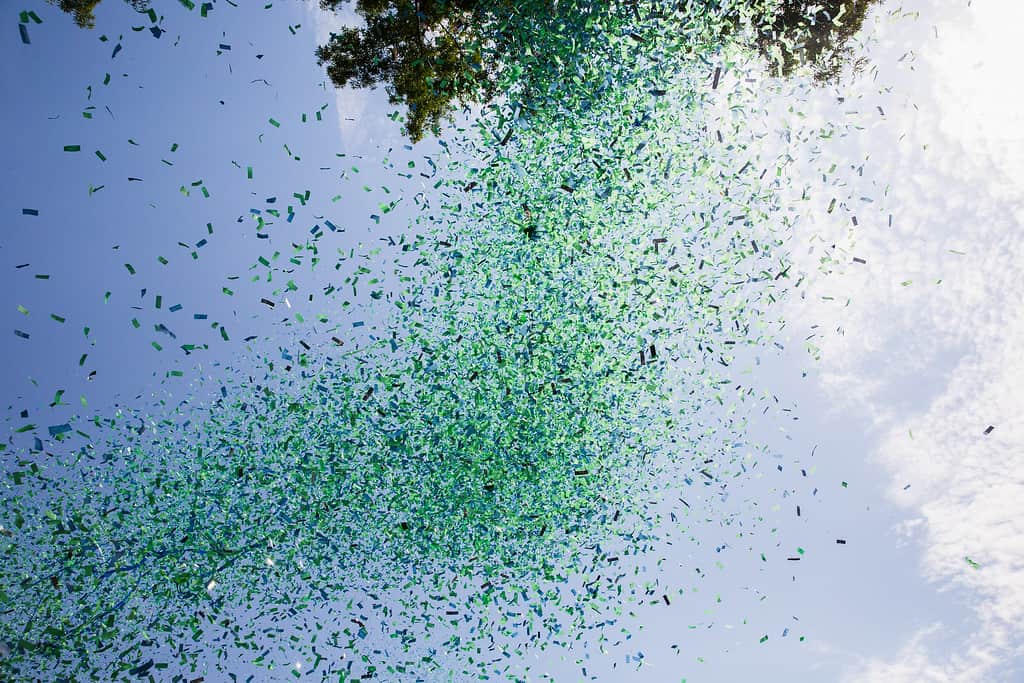 A celebratory swarm of 70-pounds of green, blue and silver confetti filled the Library Plaza on Saturday, May 12, marking the grand finale of Regent University’s 2018 Commencement.